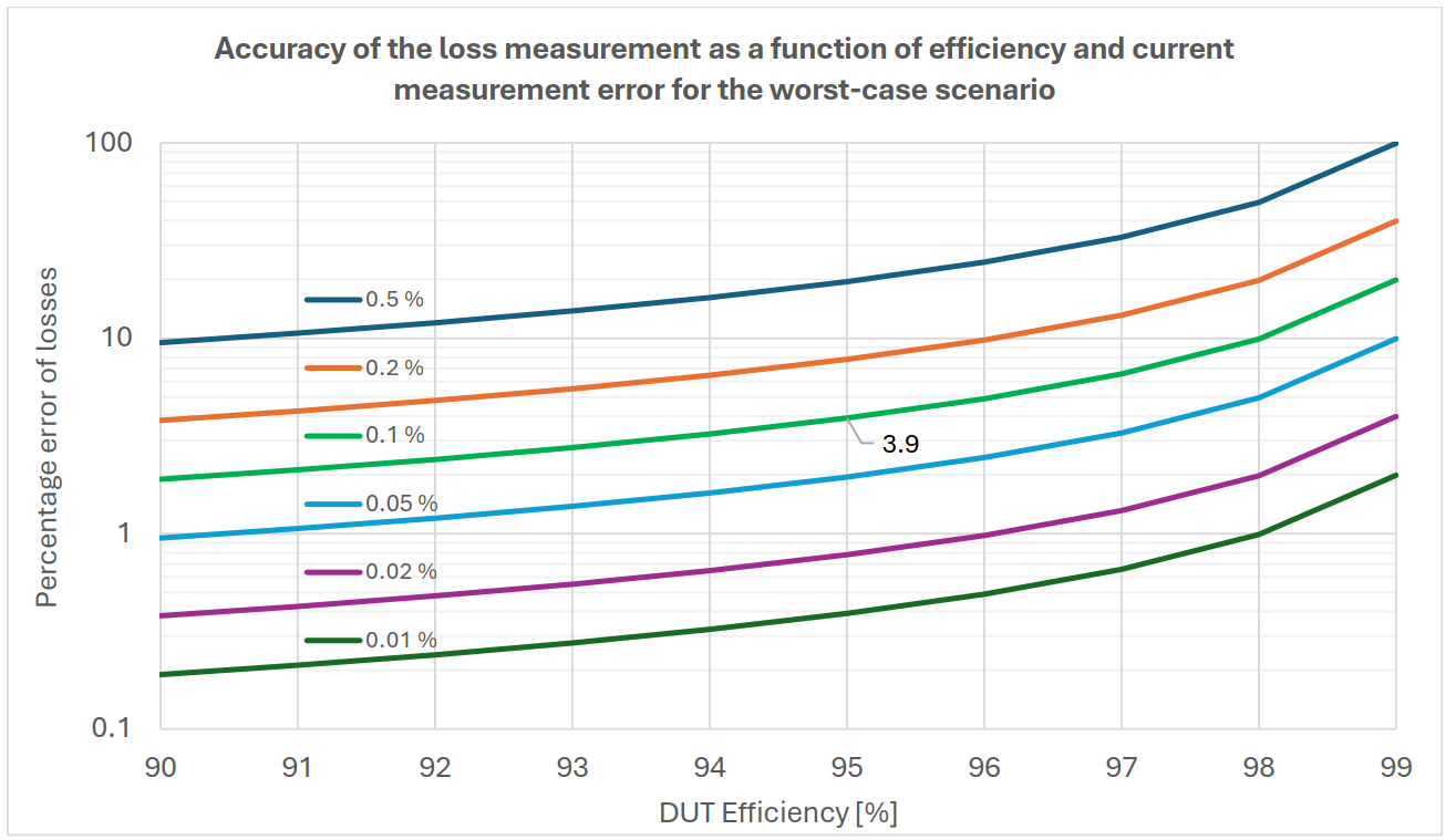 如果使用精度為 0.1% 的電流傳感器測量輸入和輸出功率,則在最壞情況下,頻率轉換器等測試設備的計算功率損耗可能與真實值偏差 3.9%。下圖(圖 3)顯示了電流測量中各種比率誤差對損耗計算中百分比偏差的影響。在實際應用中,還必須考慮功率分析儀或電壓傳感器的測量誤差。對於 0.1% 的精度,綠線上標記了 3.9% 的計算值。損耗計算中的百分比誤差隨著被測設備效率的提高而增加。