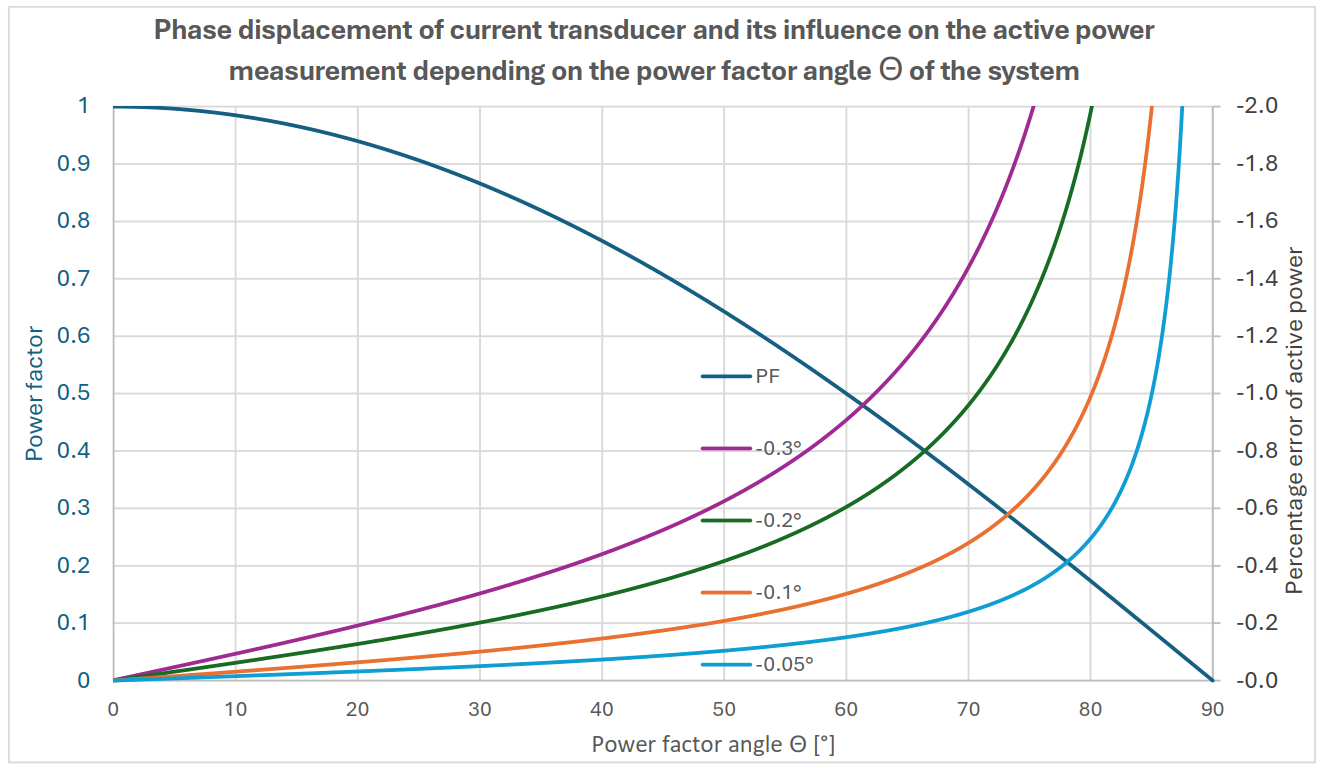 電流傳感器的相位誤差會改變電流和電壓信號之間的相角 Θ。對有功功率測量中百分比誤差的影響在很大程度上取決於系統的功率因數,因為三角函數是非線性的。如果被測設備消耗有功功率和無功功率,電流互感器或測量系統引起的相移角增加會導致無功功率增加,同時有功功率減少。這種關係如下圖所示。