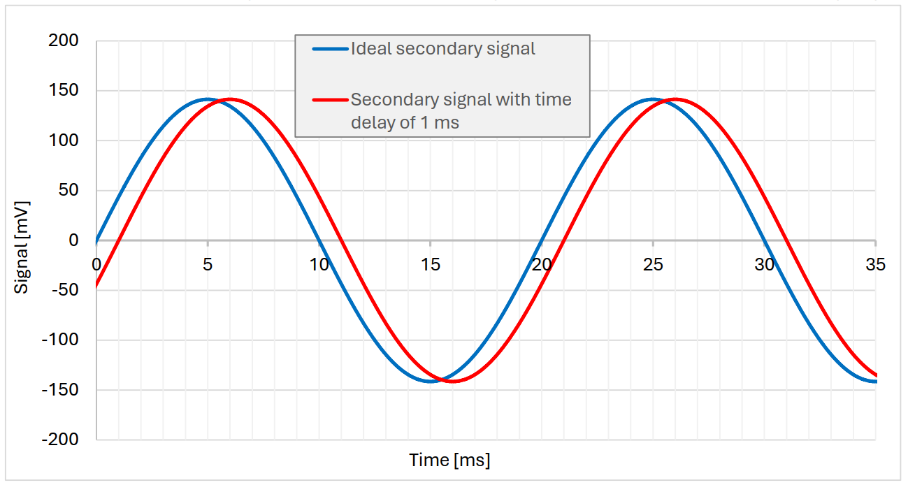 如果電流傳感器現在產生一毫秒的時間延遲,二次信號將向右移動一毫秒。在這種情況下,紅色的時間延遲二次信號滯後於理想信號。信號的週期T可以通過頻率f的倒數計算。