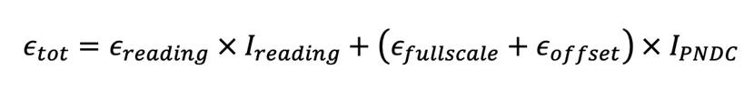 如果您有一個混合訊號,則應針對每個頻率分量計算精準度。 在此範例中,我們將計算直流訊號的精準度。 因此,我們使用規格書中指定低於 10 Hz (<10 Hz) 的頻率的精準度數據。 總比率誤差可以透過以下方程式計算。