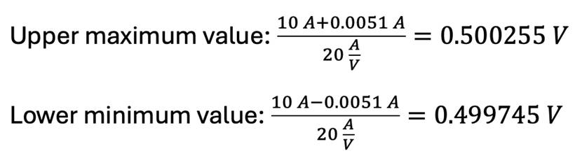 如果您擁有一個沒有任何振幅誤差的理想電流感測器。 但我們已經計算出一個 . 這表示您的測量設備顯示的電壓介於以下計算值之間。