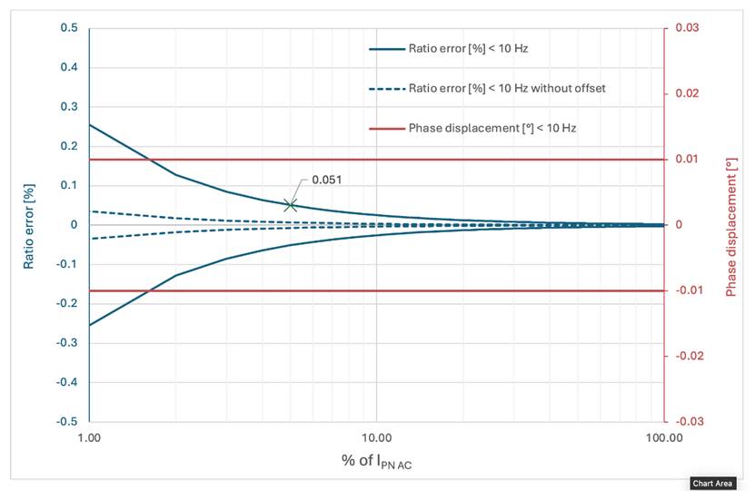 若在測量裝置(如電力分析儀或六位半電錶)中補償電流感測器的直流偏移(offset),便能達到最高的可能精確度。虛線表示未經直流偏移補償的精確度。對於此電流感測器,在2.5mA的一次電流(IPN直流電流的0.005%)下,精確度為+-2%。