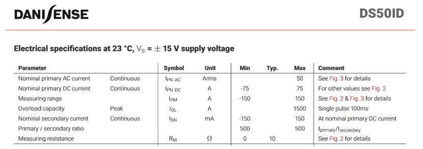 讓我們以 DS50ID 電流感測器為例,在規格書中可以找到以下資訊。