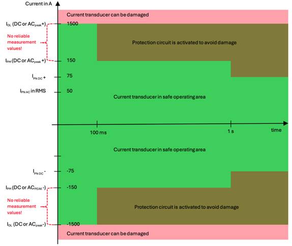 下圖顯示了與一次側電流相關的個別數據。 電流感測器可以在綠色範圍內操作。無論持續時間長短,高於過載容量 (IOL) 的一次側電流都可能損壞電流感測器。若非有先進感測器保護電路 (ASPC),在 100 毫秒到 ~1 秒的時間間隔內,介於 150 安培和 1500 安培之間的一次側電流也可能損壞感測器。 有關此保護方法的特性,請參閱使用手冊中的“4.9 先進感測器保護電路 (ASPC)”一章。在 ~1 秒以上的時間間隔內,介於最低 75 安培(取決於負載和電纜電阻值、電源電壓、環境溫度等)和 1500 安培之間的一次側電流會驅使電流感測器進入飽和狀態並啟動 ASPC。 有關更多資訊,請參閱使用手冊中的“4.3 飽和行為”和“4.9 先進感測器保護電路 (ASPC)”章節。
