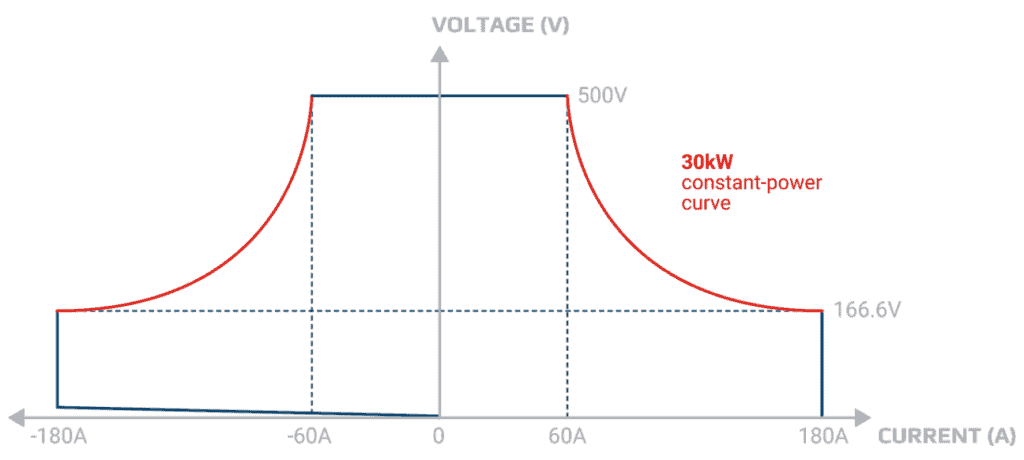 Full power DC power supplies are typically specified for maximum power output at a specific voltage (V) and current (I), P=Vmax × Imax.